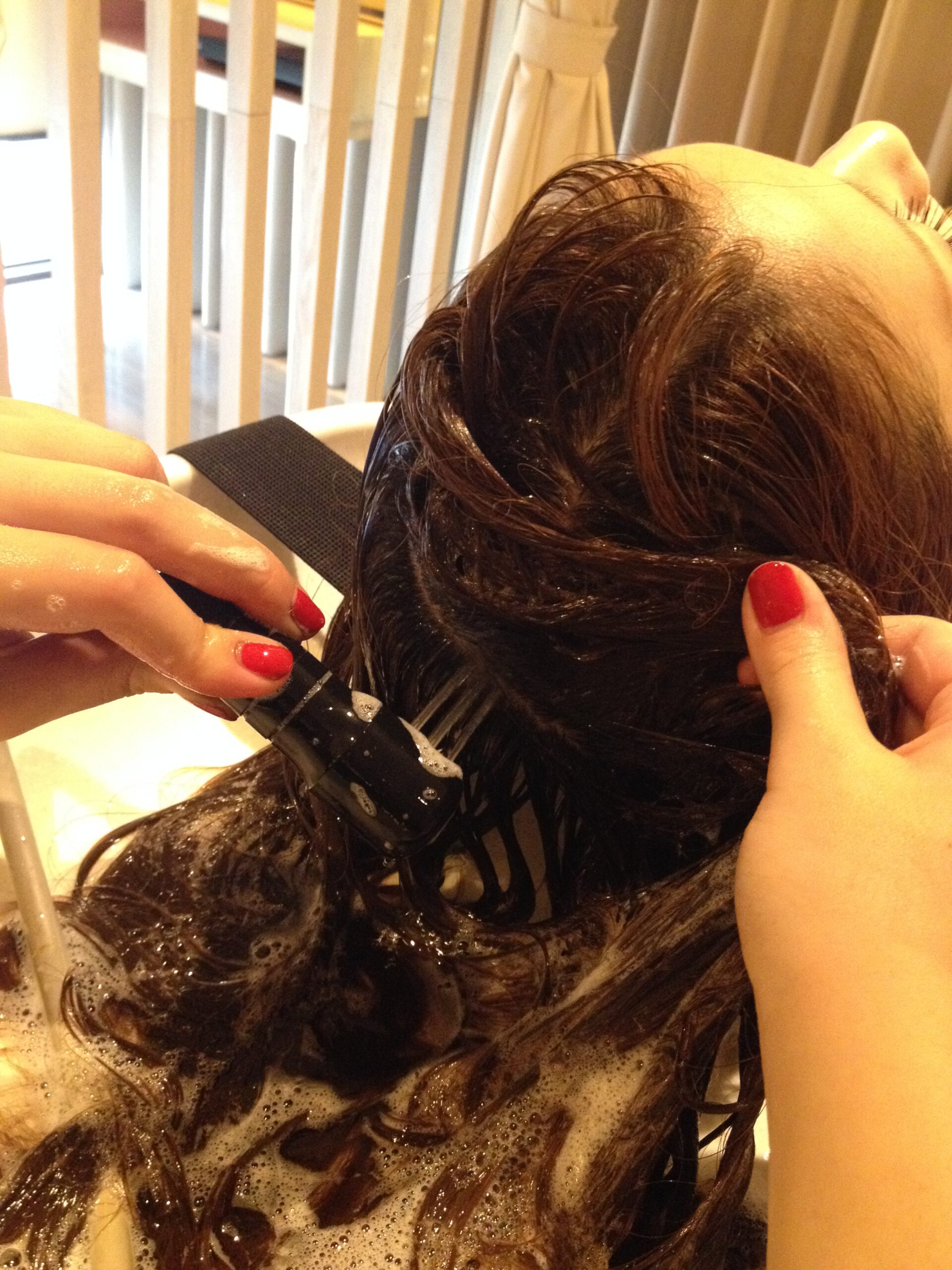 *今回の場合では、カラーの繰り返しによるダメージと判断し、ハーブマジックカラーで髪と頭皮をケアしつつ施術することに決定しました。
