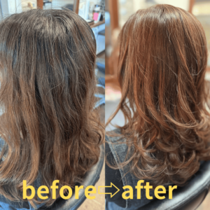 パサパサでまとまらない髪やハリコシがなくなってきたと感じる方など様々なお悩み解消し、サラサラでつやのある仕上がりは、今までの美容室のヘアカラーとの違いに感動していただけます。